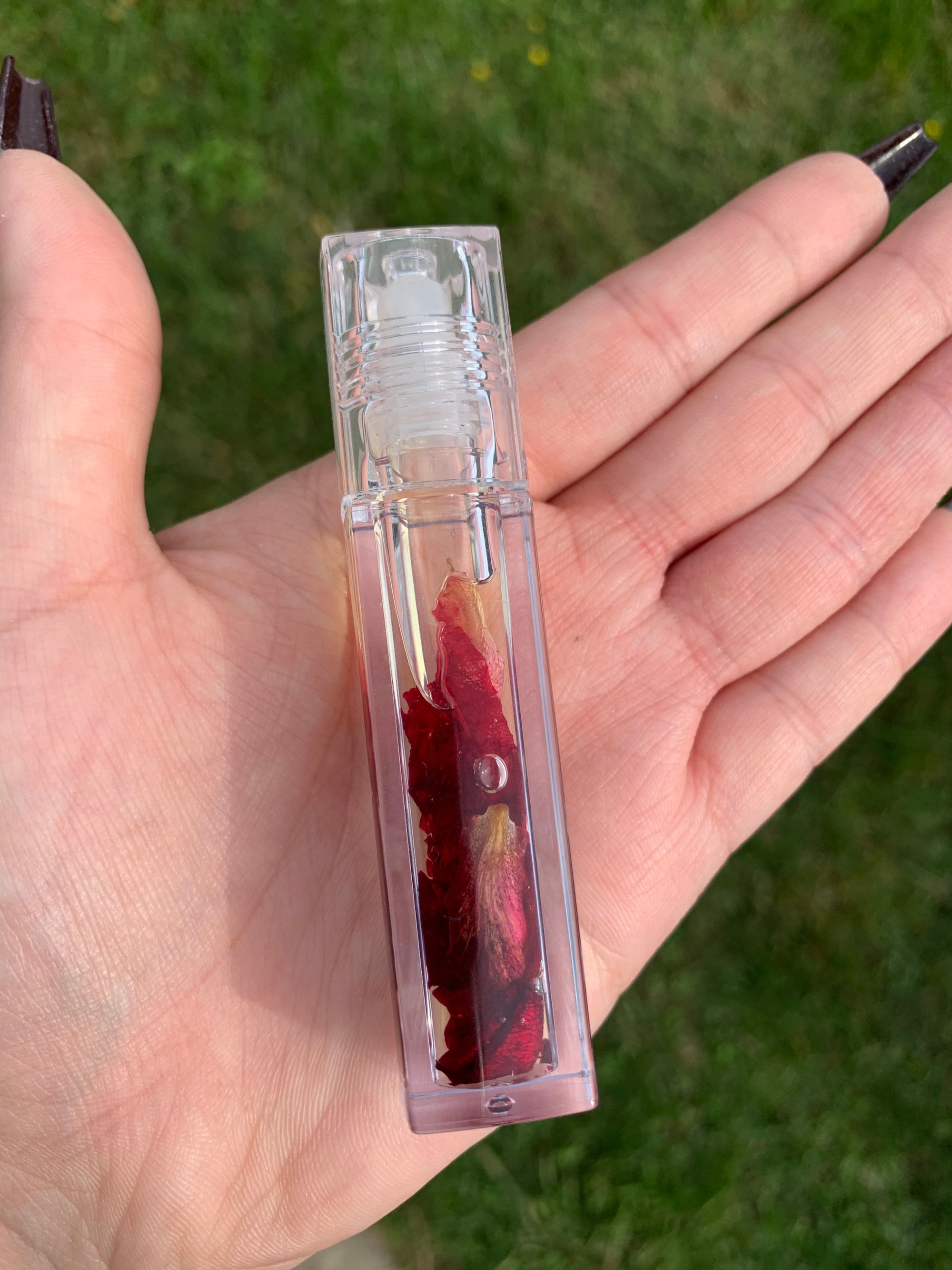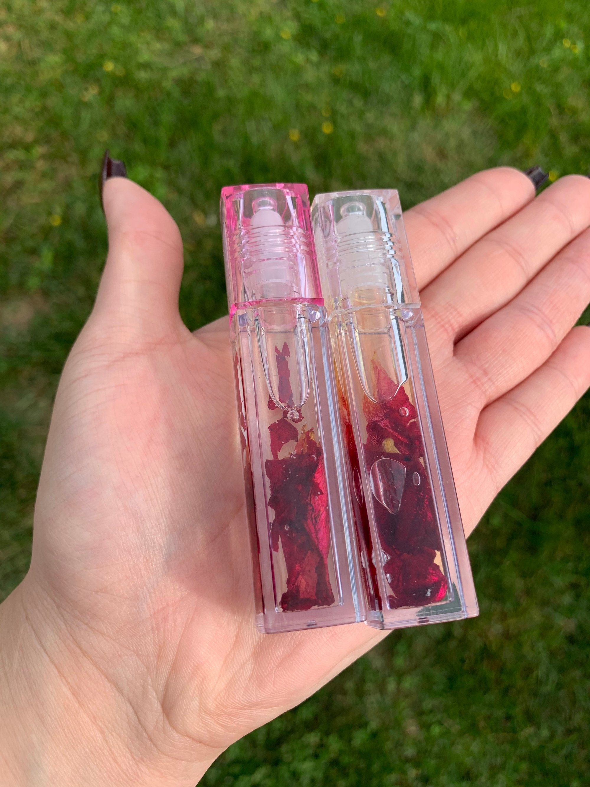This is a vanilla flavored lip oil, that is infused with rose petals. It is rich in nutrients that have healing properties and promote lip health. Your lips will feel hydrated and nourished.